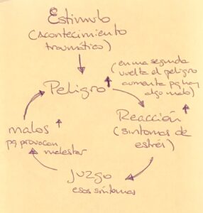 Un matiz de esto son las personas que se pelean contra sus síntomas. Un estímulo provoca un malestar que el cuerpo identifica como un peligro. La respuesta natural del cuerpo ante ese peligro es activarse y reaccionar para afrontarlo o huir de él lo que provoca unos síntomas. Esos síntomas la persona los juzga como malos ¿y si algo es malo es seguro o peligroso? Evidentemente peligroso así que el peligro aumenta, lógicamente eso hace aumentar los síntomas lo que los hace más fuertes y la persona los juzga como peores y entonces más peligrosos creando un circulo vicioso en el que el estímulo inicial (ese que digo que es el dolor que está dentro) ni siquiera es ya importante porque la persona tiene miedo de sus propios síntomas de miedo. Un círculo vicioso que la persona alimenta al tratar de evitar el dolor sin darse cuenta de que es ella misma la que lo esta provocando.